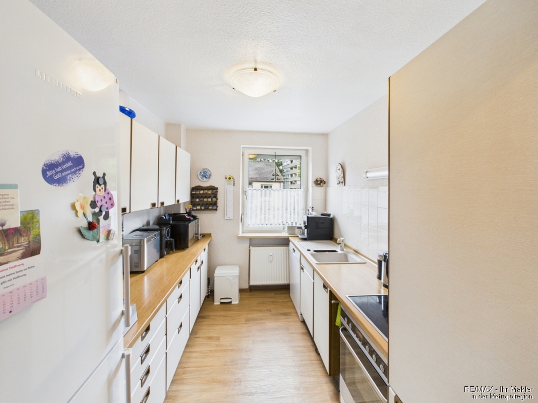 Der helle Wohnbereich mit großer Fensterfront und Zugang zum Balkon schafft eine einladende Atmosphäre und lädt zu gemütlichen Stunden ein. Die funktional gestaltete Küche bietet ebenfalls genügend Raum zum Kochen und gemeinschaftlichen Genießen.