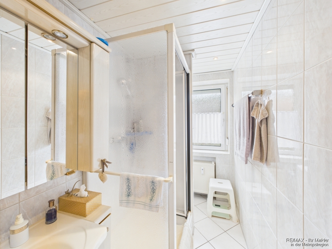 Das Badezimmer mit Dusche, ein separates WC sowie ein großzügiger Flurbereich runden das Raumangebot ab. Große Fenster lassen viel Tageslicht herein und bieten einen schönen Ausblick ins Grüne.